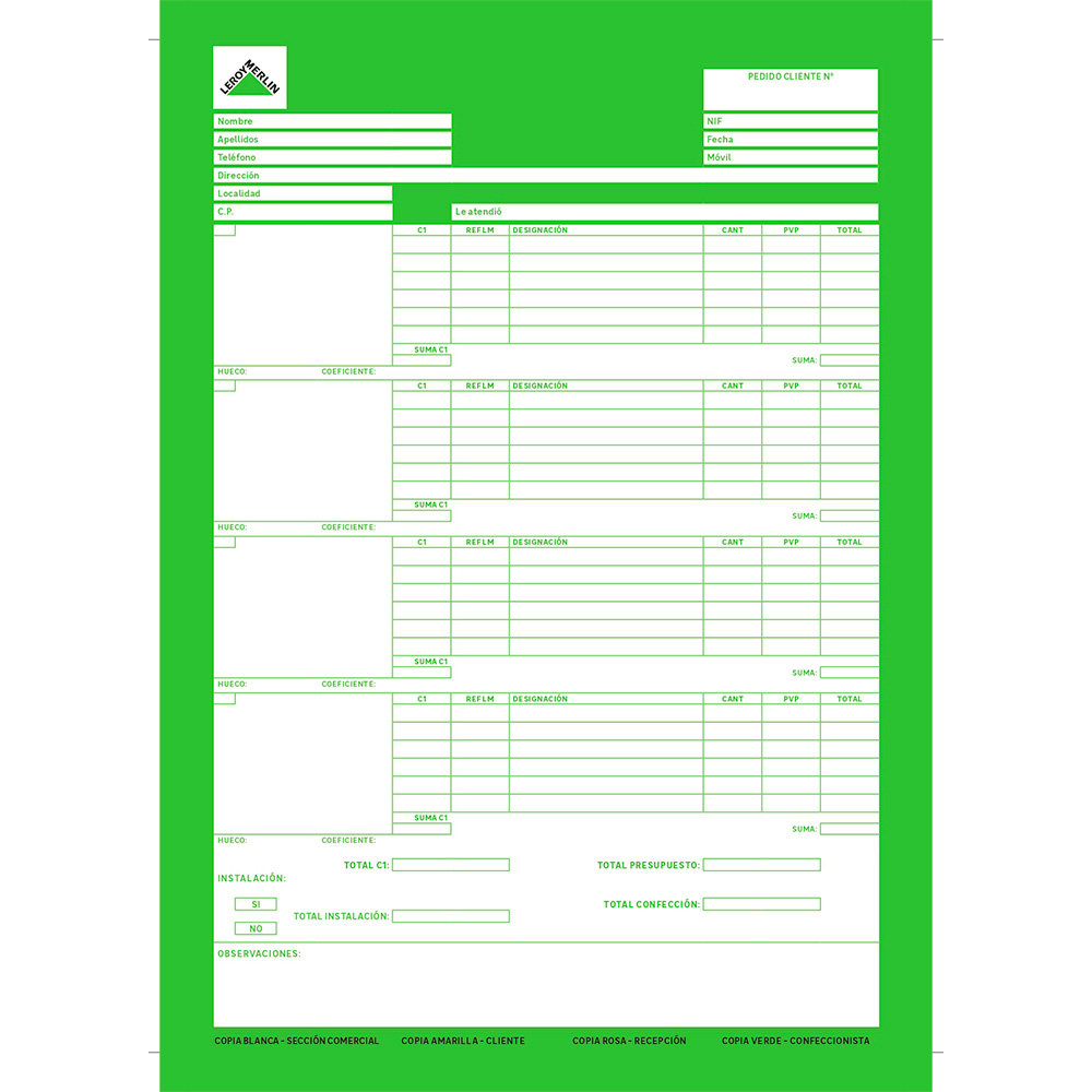 Talonarios de 25 juegos de 4 hojas numerados en la parte de arriba. Tamaño 210×297 mm
